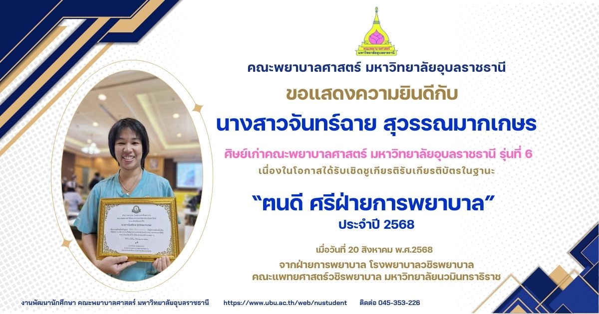 คณะพยาบาลศาสตร์ ขอแสดงความยินดีกับ นางสาวจันทร์ฉาย สุวรรณมากเกษร ศิษย์เก่าคณะพยาบาลศาสตร์ มหาวิทยาลัยอุบลราชธานี รุ่นที่ 6 เนื่องในโอกาสได้รับเชิดชูเกียรติรับเกียรติบัตรในฐานะ “ฅนดี ศรีฝ่ายการพยาบาล” ประจำปี 2568