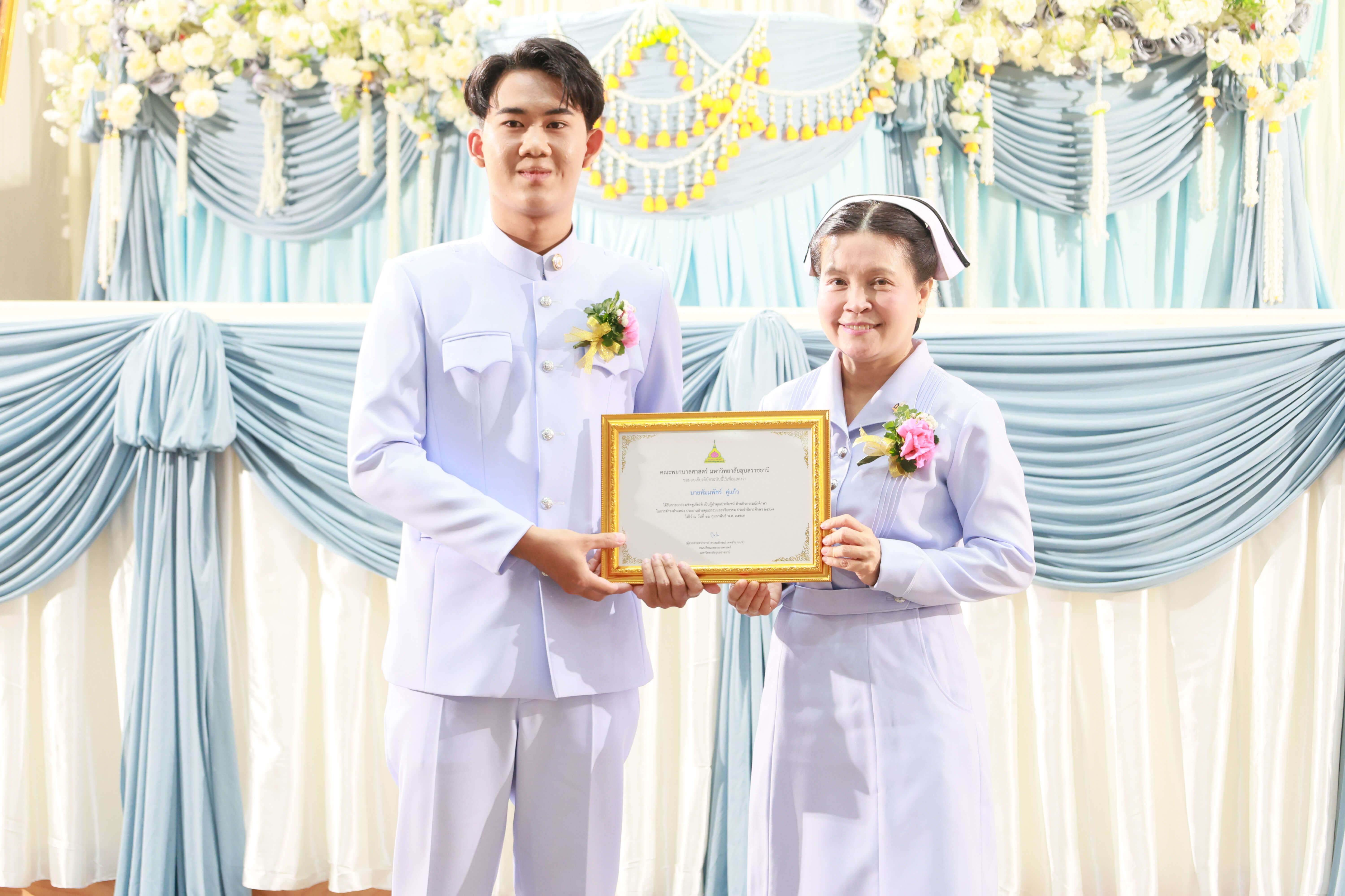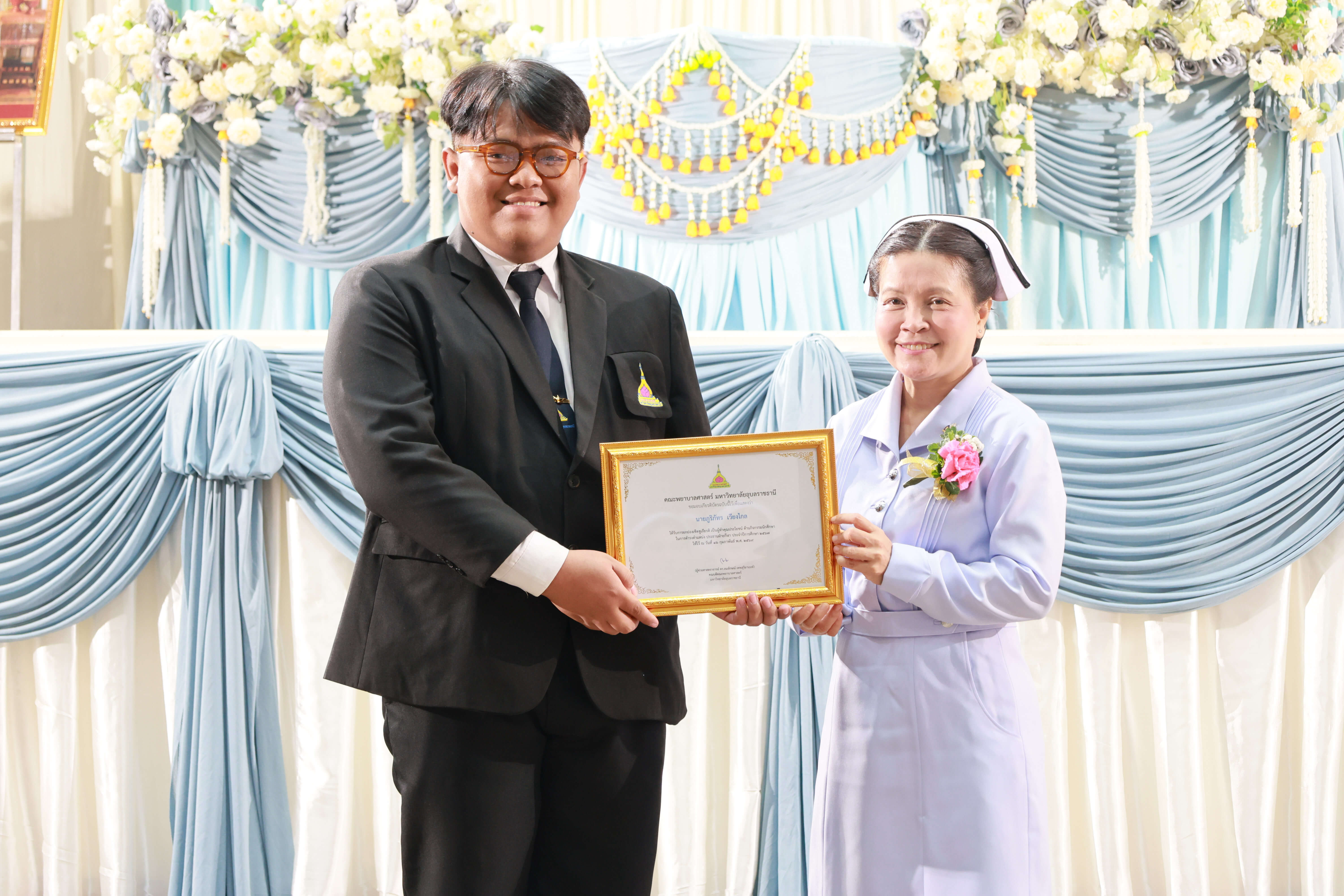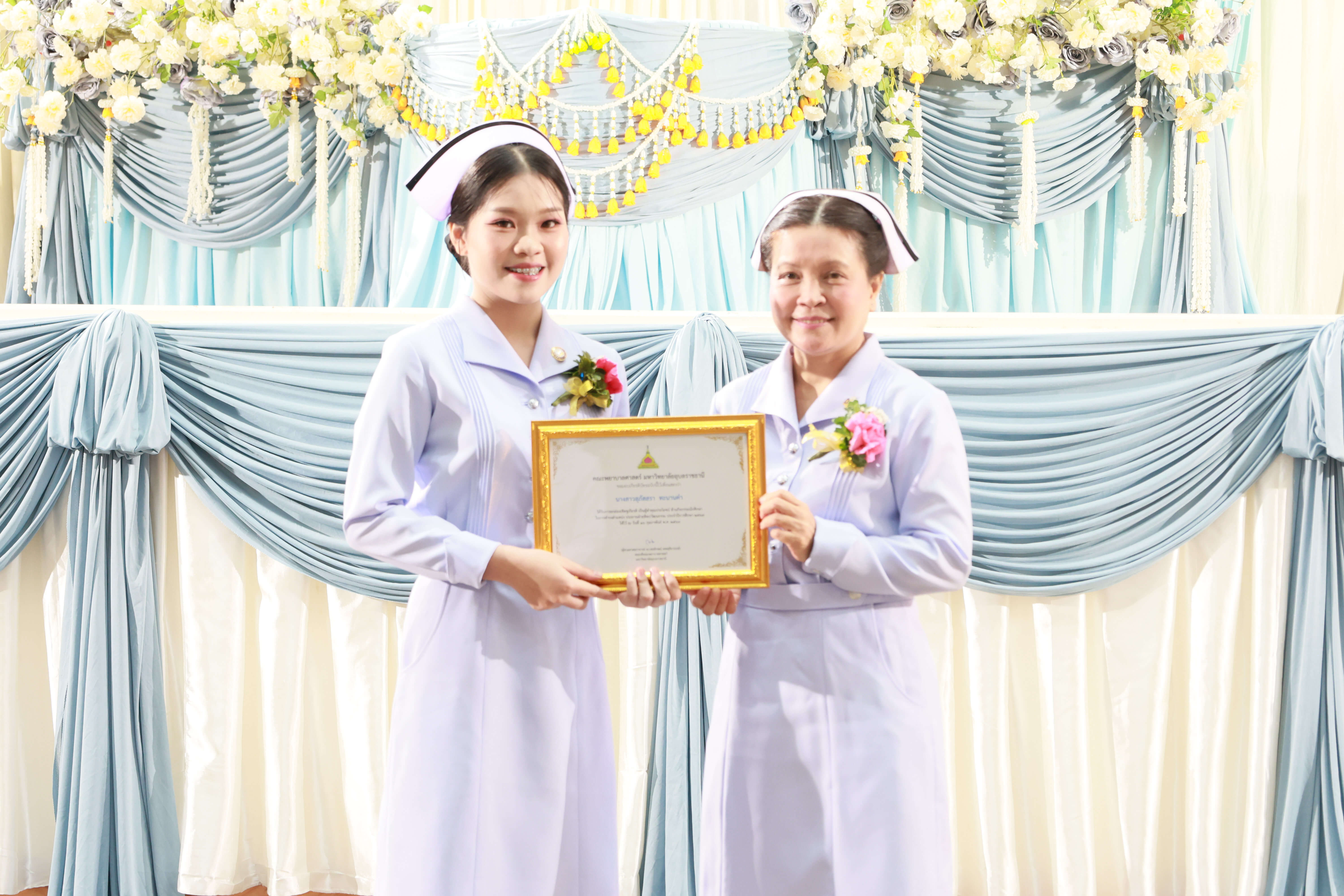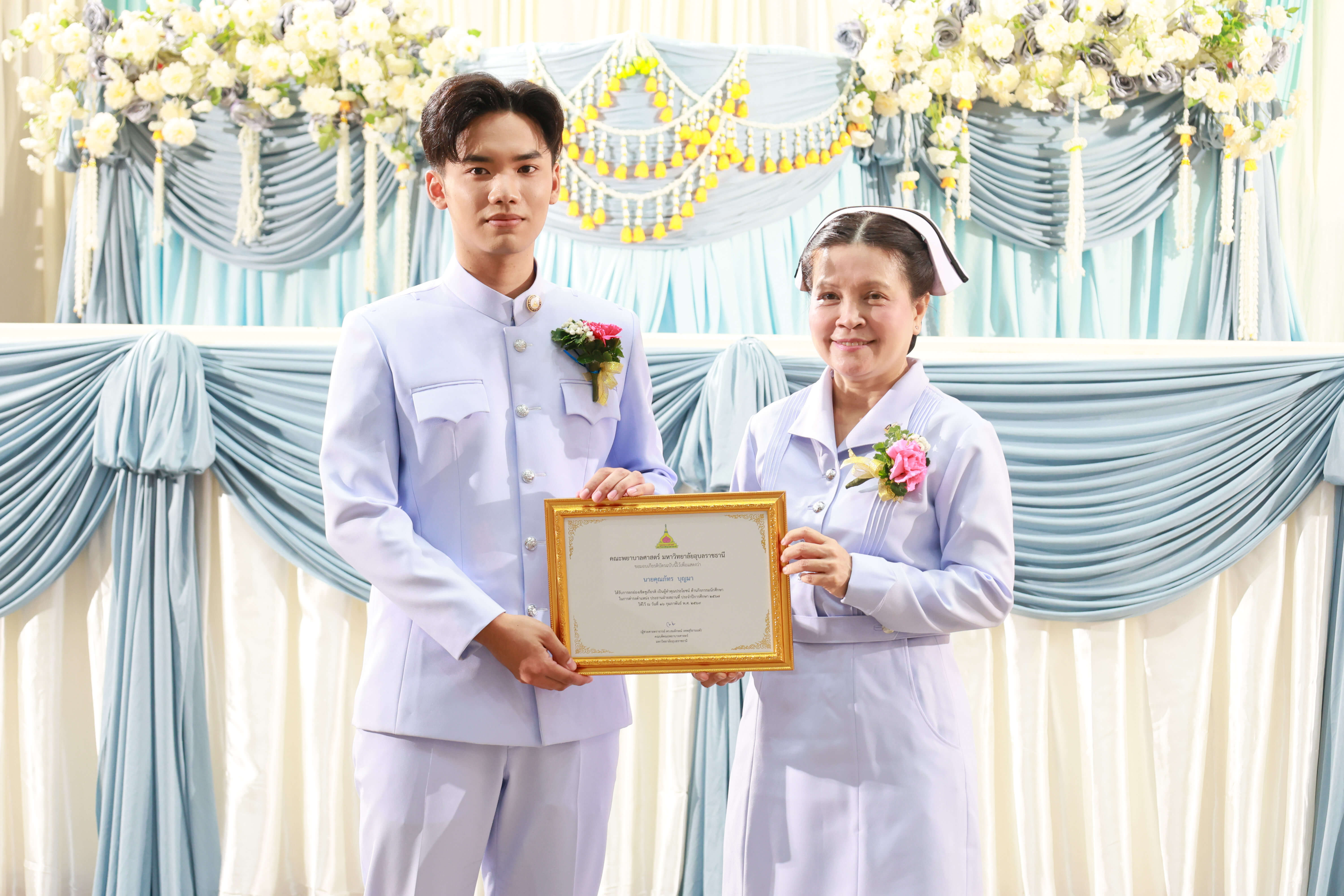 ในโอกาสนี้ ผู้ช่วยศาสตราจารย์ ดร.สมลักษณ์ เทพสุริยานนท์ คณบดีคณะพยาบาลศาสตร์ ให้เกียรติเป็นประธานในพิธี พร้อมกล่าวให้โอวาทแก่ผู้สำเร็จการศึกษา เพื่อเป็นแนวทางในการดำเนินชีวิตและการปฏิบัติงานในวิชาชีพพยาบาลต่อไป โดยมี ผู้ช่วยศาสตราจารย์ ธมกร เธียรภูริเดช รองคณบดีฝ่ายวิชาการ กล่าวรายงานการจัดโครงการ